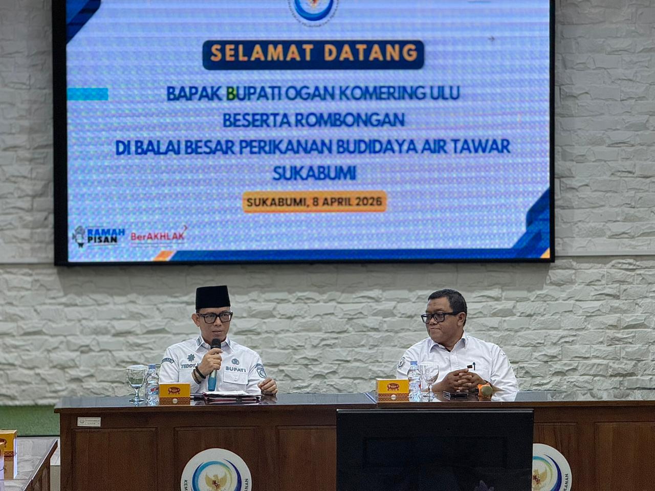 Sumselnews.co.id Sukabumi | Rapat teknis dan Kunjungan ke Balai Besar Perikanan Air Tawar (BBPAT) Sukabumi, pada Rabu 8 April 2026, oleh Bupati OKU H Teddy Meilwansyah SSTP MM MPd bersama Dinas terkait tidak lain guna kita mempersiapkan Kabupaten OKU sebagai salah satu lokus program pembangunan Kampung Nelayan merah Putih (KNMP) dari kementrian perikanan RI guna mendukung program presiden Prabowo yaitu mewujudkan ketahanan pangan.