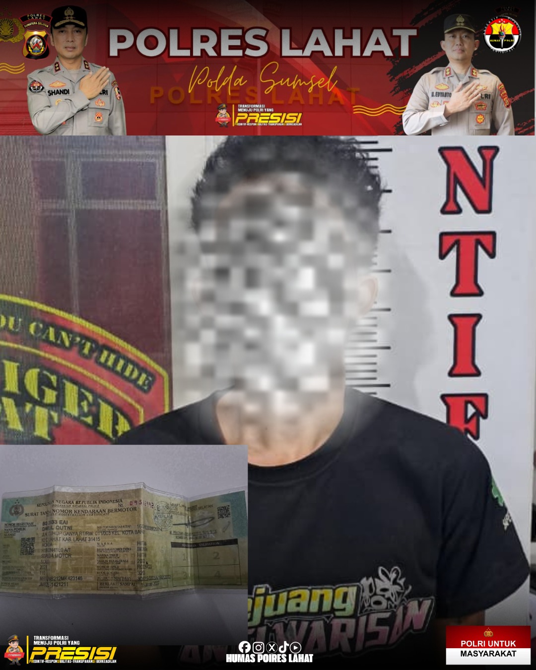 Setelah melalui serangkaian penyelidikan intensif, terkait hilangnya sepeda motor di salah satu wilayah di Kabupaten Lahat. Berbekal laporan itu, tim segera bergerak cepat melakukan pengumpulan informasi dan olah tempat kejadian perkara.